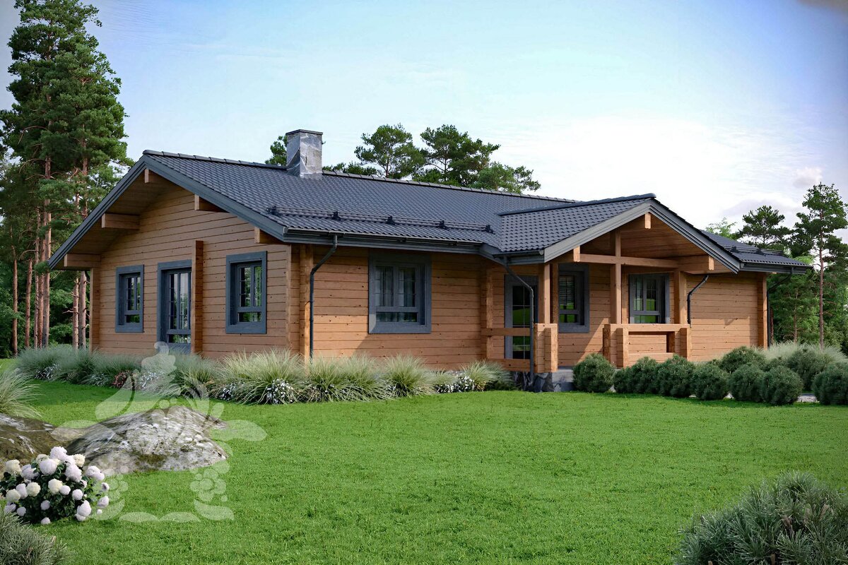 Использованный кровельный материал цементно-песчаная черепица BRAS «Франкфурт» имеет нелимитированный срок службы. Наилучшим образом подходит для одноэтажного дома, где визуальный акцент смещается на крышу, ее полностью видно со всех сторон. Аналогичного эффекта удалось добиться при строительстве рубленого дома «Смоленск».