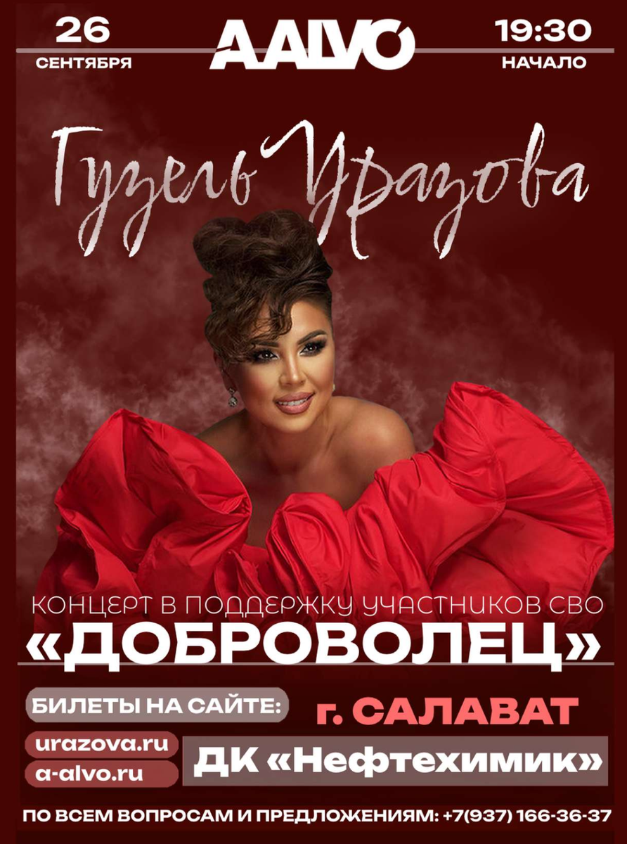 26 сентября в городе Салават состоится большой благотворительный концерт в поддержку участников СВО с участием известной певицы Гузель Уразовой. Зрителей ждёт: 📍 Место проведения: г. Салават, ул. Гагарина 2А, ДК «Нефтехимик» 🕖 Дата и время: 26 сентября 2025 г., начало в 19:30 🎟 Билеты можно приобрести онлайн на нашем сайте. ⚡ Количество мест ограничено, бронируйте заранее. Купить билеты можете на официальном сайте по ссылке - https://a-alvo.ru/