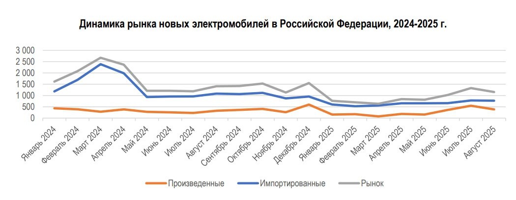 ⚡️ Свежие данные о продажах новых электромобилей в России. 🤔 По традиции, первым их публикует Минпромторг. По той же традиции, за последний месяц он отдельно данные не приводит, но можно посчитать. 📊 Итак, по данным Минпромторга, с начала года в России было продано 7 264 новых электромобиля, что на 47% меньше показателей того же периода 2024 года, когда продали 13 754 машины. 👉 Открываем пресс-релиз месячной давности, делаем простое арифметическое вычитание и получаем данные за август — 1158 машин. Тут важно отметить, что падение продаж случилось весной 2024 года. То есть из 13,5 тысяч проданных в прошлом году электрокаров больше половины были реализованы в январе-апреле, а в августе 2024 года рынок был уже похуже, чем сейчас. 🚙 Доля отечественных электромобилей за 7 месяцев увеличилась с 18% до 27%. Но на графике отчетливо видно, что в июле у них был пик, а в августе — падение продаж. Обычно такое бывает, когда на один месяц приходится крупный корпоративный контракт. Команда
