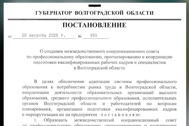Опубликовано постановление губернатора Волгоградской области от 28.08.2025 № 481 «О создании межведомственного координационного совета по профессиональному образованию, прогнозированию и координации подготовки квалифицированных рабочих кадров и специалистов в Волгоградской области».