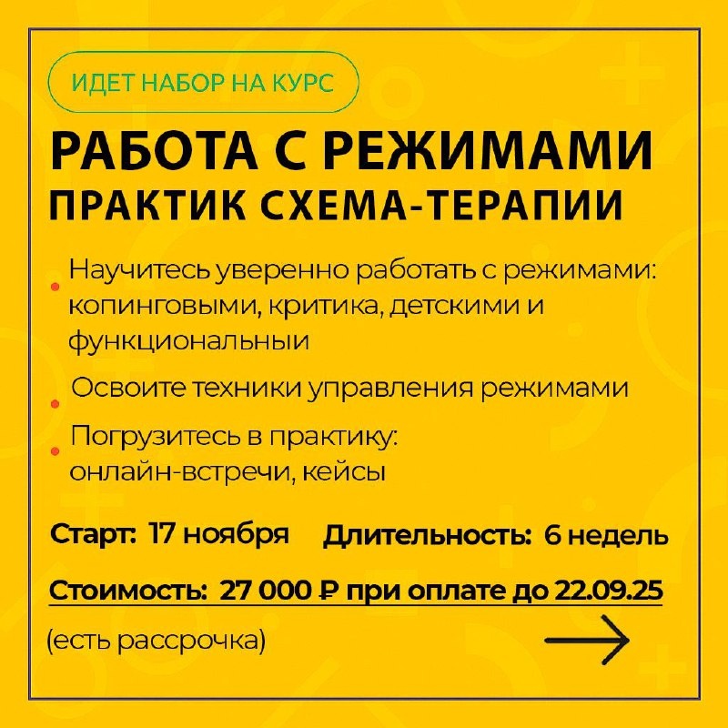 Друзья, открываю набор на курс «Практик схема-терапии: Работа с режимами» 🌿 За 6 недель мы будем учиться уверенно работать с режимами: - копинговыми, - режимами критика, - детскими, - функциональными. Чему научимся: ✔️ различать и объяснять клиенту влияние режимов; ✔️ снижать интенсивность деструктивных состояний; ✔️ активировать здоровые режимы; ✔️ применять техники прямо в сессии. Вас ждут живые онлайн-встречи, практика в парах и разборы кейсов. 🗓 Старт: 17 ноября 2025 ⏳ Длительность: 6 недель 📑 Документ: именной сертификат о прохождении авторской программы 💳 Стоимость: 27 000 ₽ — при оплате до 22.09.25 30 000 ₽ — при оплате до 22.10.25 33 000 ₽ — при оплате до 22.11.25 (есть возможность оплаты в рассрочку) ⚡ Гарантия: если курс не понравится — деньги возвращаются. 📌 Курс предназначен для тех, кто уже прошёл «Основы схема-терапии», «Практик схема-терапии. Базовый курс» у меня или любой другой вводный курс по схема-терапии. 🎁 Также вы можете приобрести сразу два курса: «
