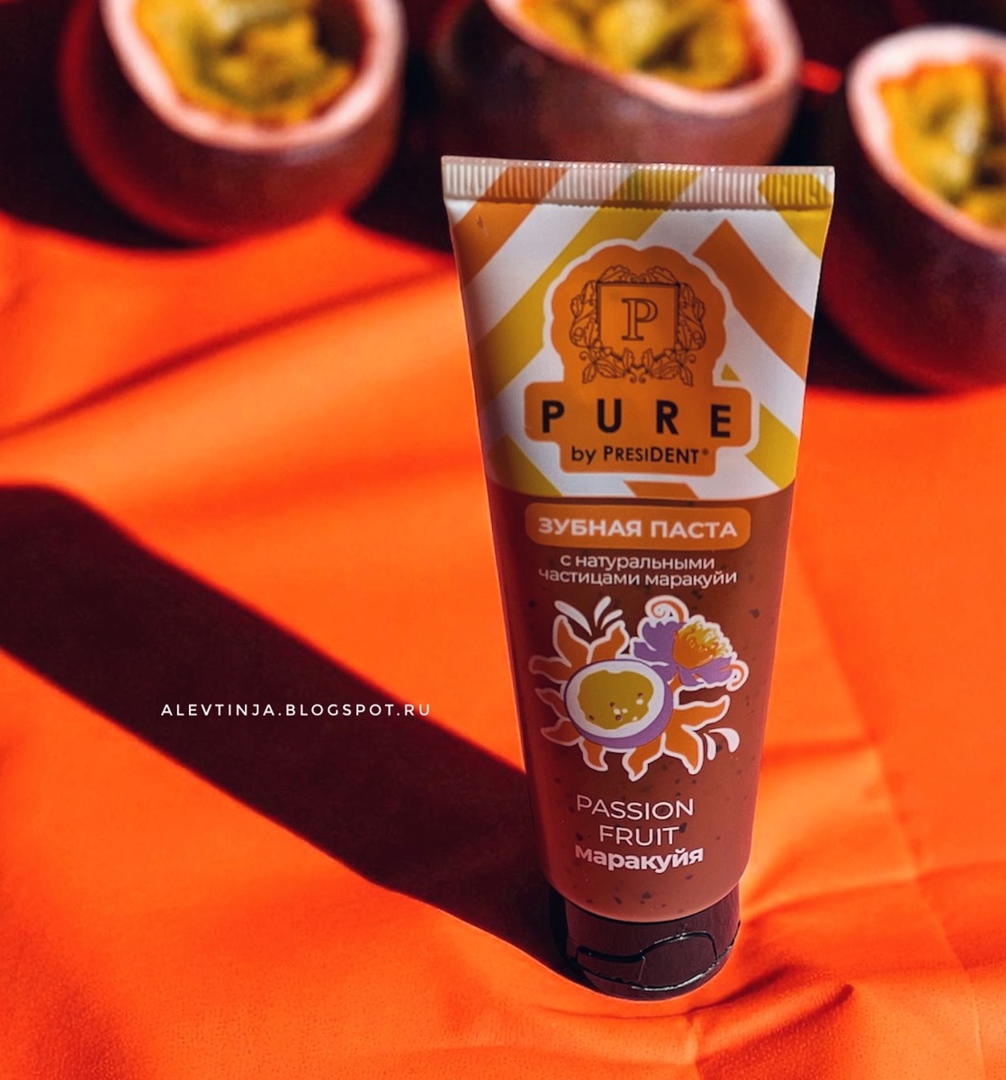 Всем привет! Спешу рассказать о прикольной во всех отношениях зубной пасте от бренда PURE by PRESIDENT. Заказать можно: - в Золотом яблоке - на Яндекс маркете В этом продукте прикольно всё - начиная составом и заканчивая вкусом. Смотрите, среди ингредиентов имеются натуральные частицы маракуйи, как вам такое? Кроме того, в состав добавили ксилитол, ментол и фтор + безопасный ПАВ (Sodium Lauroyl Sarcosinate) и кремний как базу. Упаковано все в позитивный тюбик, может показаться, оранжевого цвета. Но нет, оранжевая сама паста. Вы только посмотрите на эту консистенцию! Как-будто джем из маракуйи. А