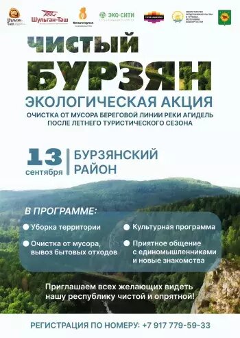 Акция направлена на ликвидацию последствий туристического сезона и объединит усилия местных жителей, экологов и туроператоров для сохранения природного богатства республики 13 сентября в Бурзянском районе Башкирии состоится экологическая акция «Чистый Бурзян», направленная на очистку береговой линии реки Агидель по маршруту от деревни Байназарово до местности «Антонова скала». Мероприятие организовано в связи с значительной антропогенной нагрузкой, вызванной активным водным туризмом в летний период. К участию приглашаются представители туристического сообщества, организаторы сплавных туров, сотрудники музея «Пещера Шульган-Таш» и заповедника «Шульган-Таш», а также эко-активисты и все желающие. Старт акции запланирован на 10.00 часов, присоединиться можно на любой точке маршрута. После завершения субботника участников ожидает культурная программа в амфитеатре музея «Пещера Шульган-Таш». Ранее «Уфимские нивы» сообщали, что в Башкирии скорректирован график посещения пещеры Шульган-Таш.