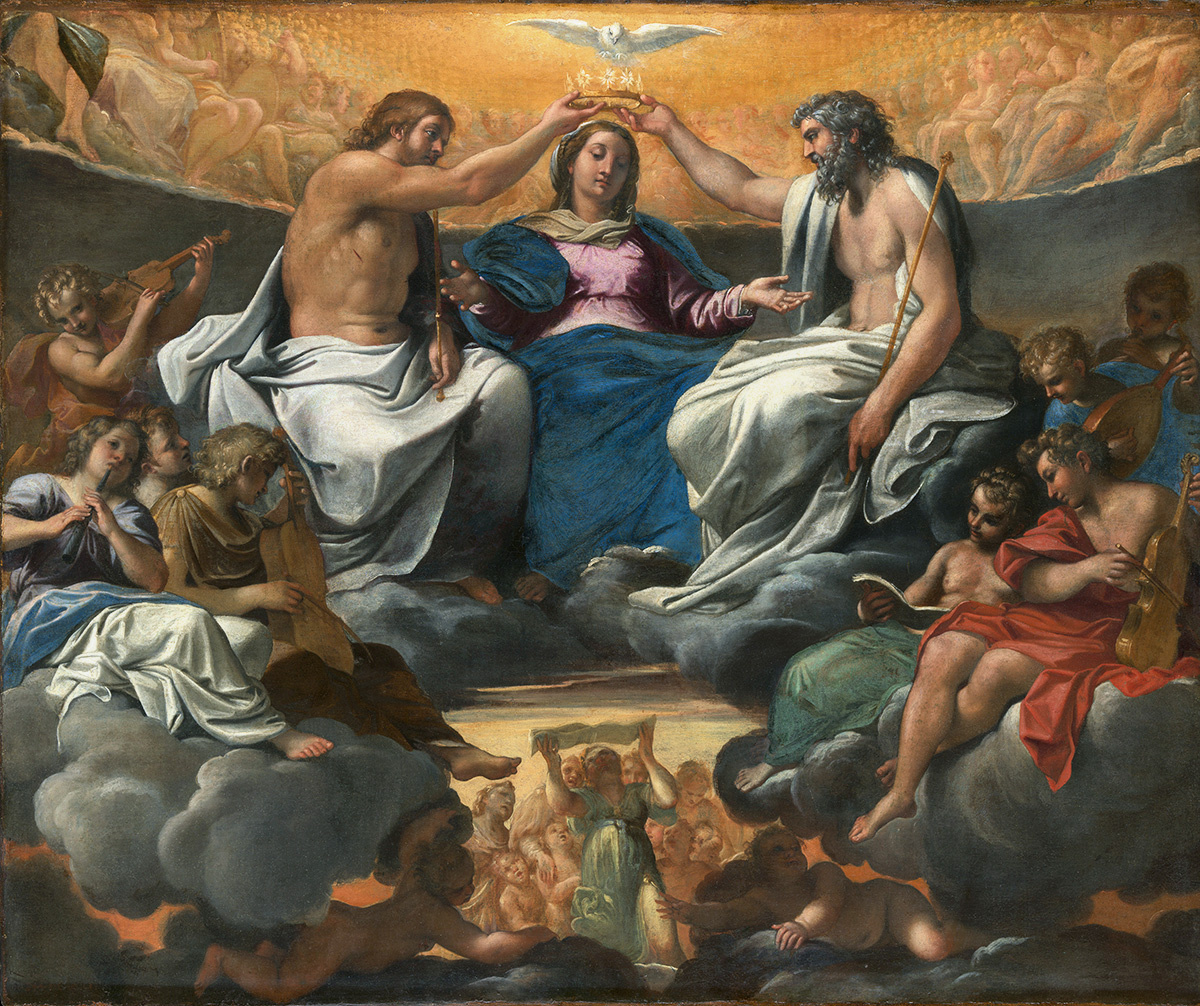 Окруженные сонмом ангелов и поддерживаемые небесными облаками, Бог Отец и Иисус Христос венчают Деву Марию как Царицу Небесную. Над её головой изображен белый голубь, символ Святого Духа. Безмятежное выражение лица Богородицы и её распростертые руки передают возвышенный дух благоговения и достоинства. Аннибале Карраччи (1560–1609) начал эту работу ещё в Болонье, и подготовительные рисунки к этой картине показывают, что изначально она была задумана в североитальянских традициях, отражая, в частности, стиль Корреджо (1489–1534) и Тинторетто (1518–1594). Однако, прибыв в Рим, Карраччи сразу же был поражен величием классического искусства и творчеством Рафаэля (1483–1520) и Микеланджело (1475-1564). Эта картина была написана для кардинала Пьетро Альдобрандини, племянника короля Климента VIII, сразу после прибытия Карраччи в Рим в 1595 году. Картина демонстрирует усвоение им принципов римской композиции; она гораздо компактнее, монументальнее и более подчеркнуто классична, чем все, что
