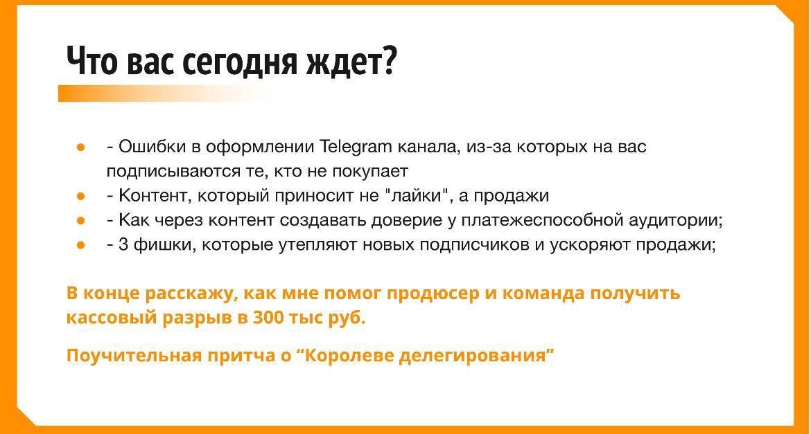 20 мин до старта 2-го дня нашего практикума «Продажи на спокойном» Для сильных и опытных экспертов. Для тех, у кого давно канал и тех, кто завел совсем недавно. Для ВСЕХ, кому нужны КЛИЕНТЫ. 2 день. 3 сентября, 11 — 13 мск УПАКОВКА, КОНТЕНТ и СМЫСЛЫ для "дорогих" клиентов Ссылка на эфир будет в канале практикума в канале практикума https://t.me/kotlyar_workshop ❗️Эфир пройдет на платформе ZOOM — рекомендую заходить с компьютера, чтобы хорошо было видно презентацию и удобно пользоваться чатом. Либо скачайте приложение на телефон заранее. Ссылка на эфир будет на этом канале за 5 мин до старта.