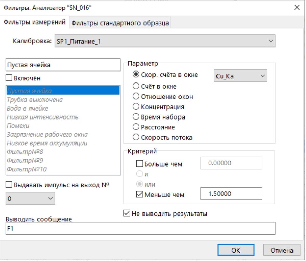 Спектр вторичного характеристического рентгеновского излучения для нас – все равно что рентгенограмма для врача. По его виду и характеристикам, по разным «окнам» и интенсивности их частей мы можем проводить достаточно глубокую аналитику. Для удобства пользователей мы ввели систему фильтров. Фильтр – это автоматический анализ спектра на программном уровне с настройкой параметров по интенсивности различных окон характеристического излучения. Например, фильтр F1 – «Пустая ячейка». Спектр пустой ячейки и заполненной – это два совершенно разных значения, сравнивая которые мы выделяем параметры, однозначно характеризующие заполненную продуктом ячейку и пустую. На эти значения заводятся фильтры. Самые частые фильтры – это F1 «Пустая ячейка» и F2 «Выключенная рентгеновская трубка». У коллег с фабрик – особенно у тех, кто только начинает работать с анализатором – часто возникают вопросы именно по F1 и F2 и в сегодняшнем посте мы расскажем подробнее о фильтре F1. Срабатывание фильтра F1 предотвр