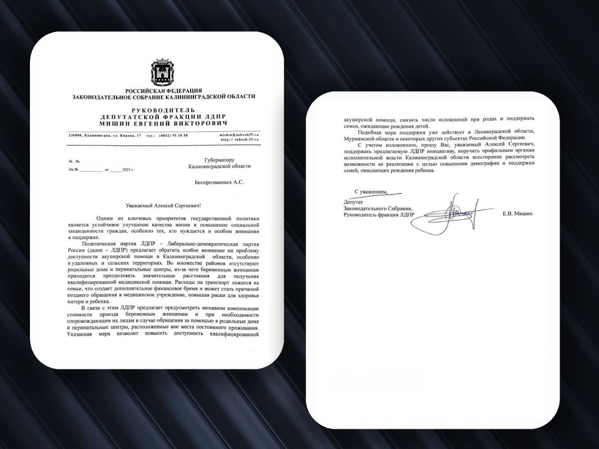 Руководитель фракции ЛДПР в Заксобрании Калининградской области Евгений Мишин обратился к Губернатору Калининградской области Алексею Сергеевичу Беспрозванных с ключевым предложением: ввести в нашем регионе компенсацию стоимости проезда для беременных женщин и их сопровождающих к медицинским учреждениям.