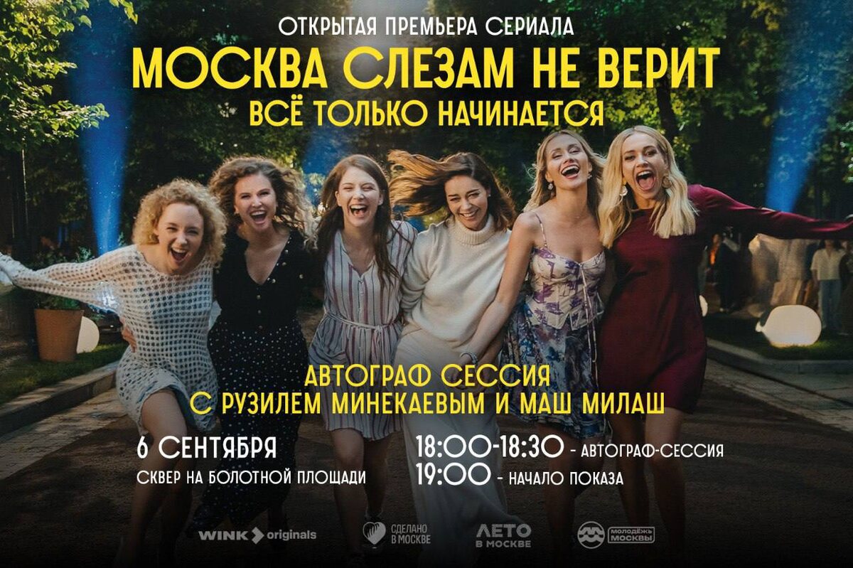 «Москва слезам не верит. Все только начинается»❤️ 🐚6 сентября на Болотной площади пройдет премьера первой серии музыкальной мелодрамы. Просмотр начнется в 19:00, но перед этим у вас будет возможность посетить автограф-сессию актеров Рузиля Минекаева и Марии Камовой (Маш Милаш). Сериал создан по мотивам советской кинокартины, но авторы рассказывают другую историю, больше подходящую под современные реалии. 🐚Главная героиня Ксюша приезжает покорять Москву с пятилетним ребенком на руках, без денег, связей и каких-либо перспектив. Выжить в столице Ксюше помогают новые подруги – прилежная студентка медицинского института Оля и взбалмошная Маша, мечтающая выйти замуж за иностранца и уехать за границу. Спустя 20 лет судьба дарит героиням еще один шанс на счастье!🐚 🐚Мероприятие пройдет при поддержке WINK, «Сделано в Москве» и «Молодежь Москвы» в рамках городского проекта «Лето в Москве». Для посещения показа необходимо зарегистрироваться в сервисе «Мосбилет».