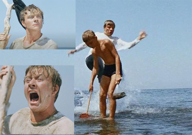 Кстати, во время съемок актеры всё никак не могли синхронизироваться. Дубль за дублем получалось, что сначала юный рыбак падал в воду, а уже потом Геша его пинал.