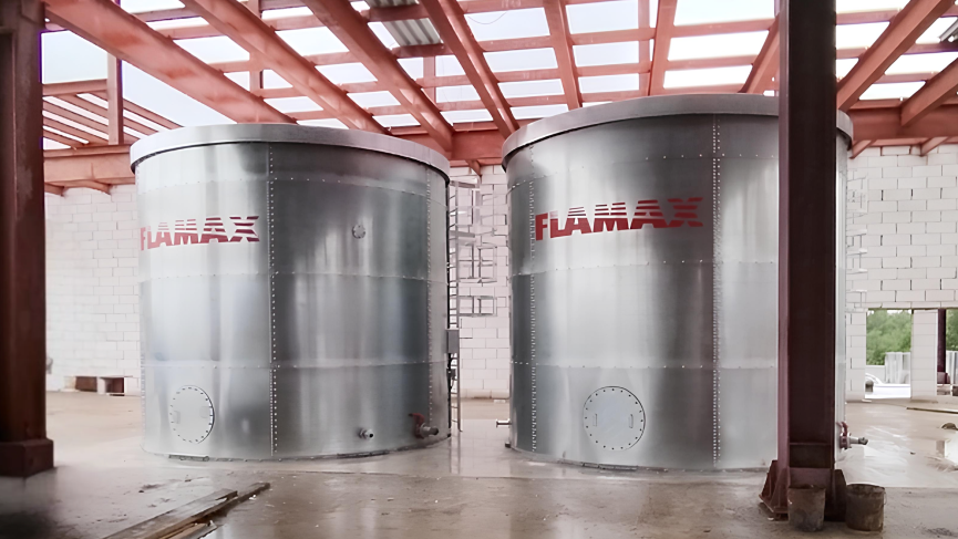 В соответствии с потребностями заказчика, проектировщики FLAMAX оперативно разработали проект, а собственный завод металлообработки изготовил сборные стальные резервуары, суммарным объемом 114 м3. Габариты были приняты классические: диаметр - 4.68 м, высота - 4.21 м. Конструкции были предназначены для установки в холодном вентилируемом, но неотапливаемом помещении, поэтому они получили уличное исполнение, в том числе усиление и утепление стенок, дна и крыши, установку ТЭНов, полностью подготовивших их ко всесезонной эксплуатации.