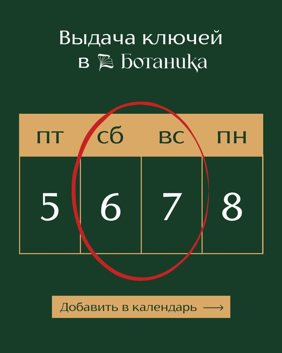 🌱Долгожданное получение ключей уже на этой неделе! Ждём всех жителей БОТАНИКИ на празднике 6 и 7 сентября. 🔑 Выдача ключей будет осуществляться в удобное время, которое заранее выбрал каждый владелец квартиры с предчистовой отделкой. Для всех жителей двери БОТАНИКИ будут открыты с 10:00 до 18:00. 🎉Мы приготовили для вас много приятных сюрпризов. Чтобы разделить этот трогательный момент вместе, приходите всей семьёй. До встречи в эти выходные!