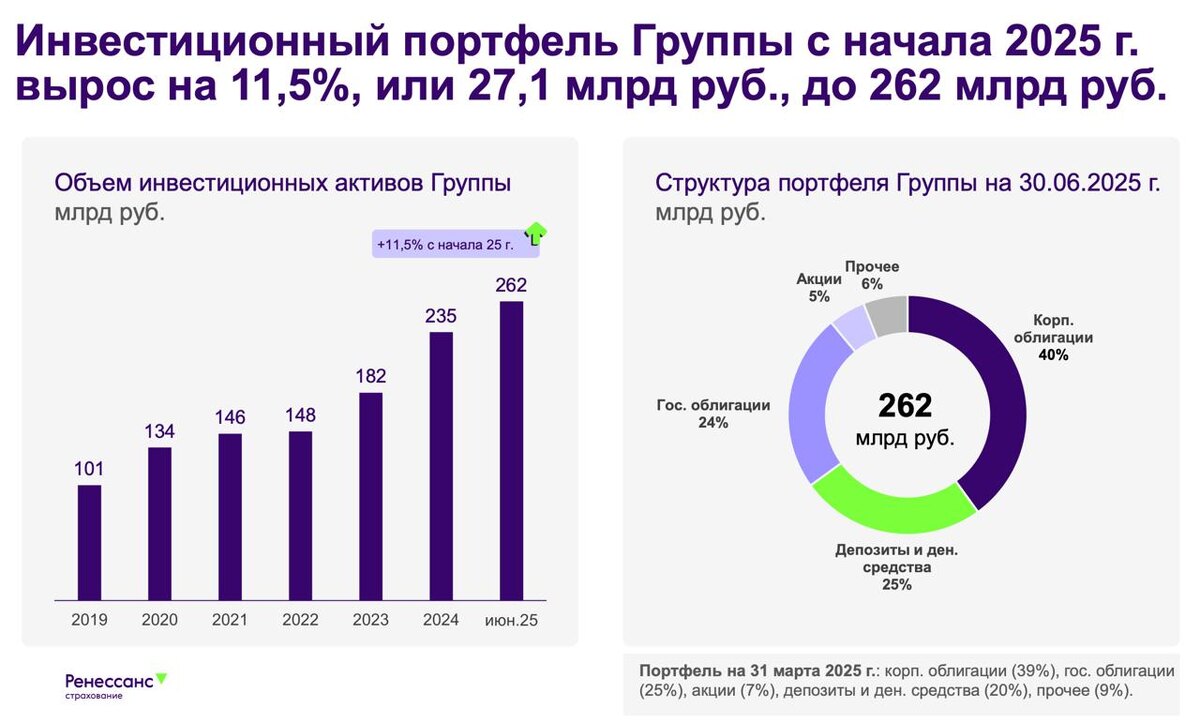 На прошлой неделе все компании разом опубликовали свои отчеты за первое полугодие 2025 года. Работы уйма, поэтому ударно продолжаем знакомиться с результатами их деятельности. Сегодня у меня на столе отчет нашего публичного страховщика - Группу Ренессанс страхование. 🏦 Итак, суммарные страховые премии компании за отчетный период выросли на 26% и достигли 92,2 млрд рублей. Основной драйвер — накопительное страхование жизни (НСЖ), премии по которому увеличились почти в два раза (+99,5%) и достигли 52,7 млрд. Доля Life-сегмента в структуре бизнеса компании выросла до 63% в 2025 году, что отражает высокий спрос на накопительные продукты в условиях высоких ставок и привлекательных доходностей инвестиций. Более скромные результаты показал сегмент non-life, премии которого практически остались на уровне прошлого года в 34,2 млрд рублей. При этом автострахование снижается из-за падения рынка новых автомобилей (–26% г/г), а вот КАСКО для физических лиц выросло на 13%, продажи страховых решений