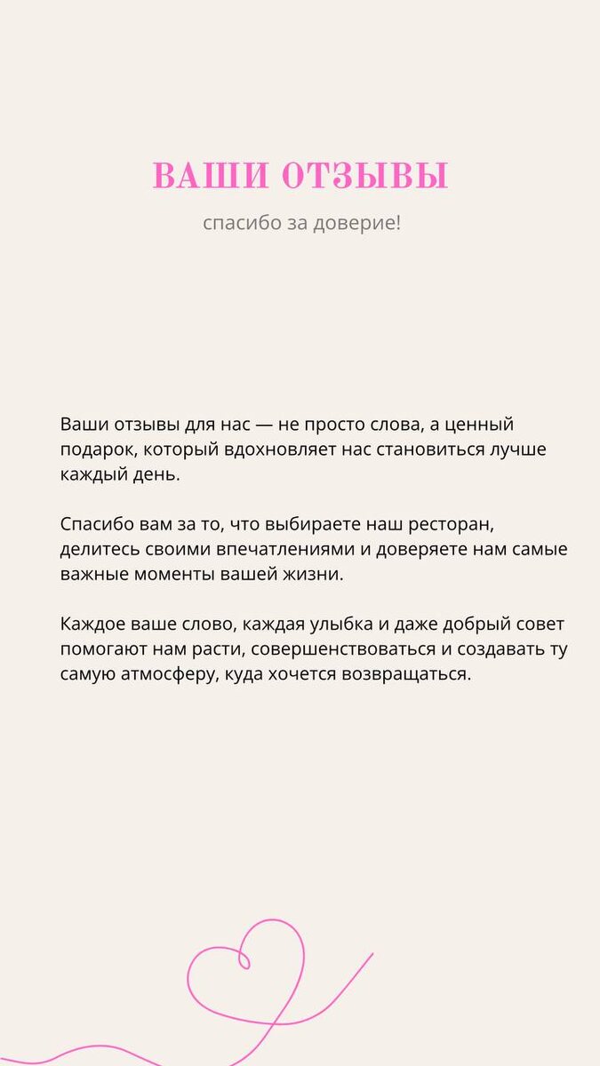 Спасибо вам за тёплые слова и отзывы о нашем ресторане💘 Нам приятно знать, что вы цените нашу кухню и атмосферу. Ваши впечатления вдохновляют нас готовить с ещё большей любовью и делать каждый ваш визит особенным!