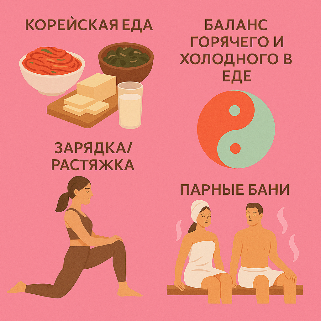 «Молодость — это не только лицо. Это суставы, гибкость, лёгкость движений». И чем глубже я изучала их привычки, тем яснее понимала: секрет в питании, маленьких ежедневных ритуалах и особом отношении к телу. В Корее к еде относятся не просто как к источнику энергии. Там каждый продукт рассматривают через призму пользы. Я попробовала включить в рацион хотя бы часть этих продуктов — и заметила, что кожа стала более ровной, а пищеварение спокойнее. Корейцы уверены: баланс горячего и холодного в еде влияет на здоровье суставов и кожи. Например, после холодных блюд (салатов, фрукто