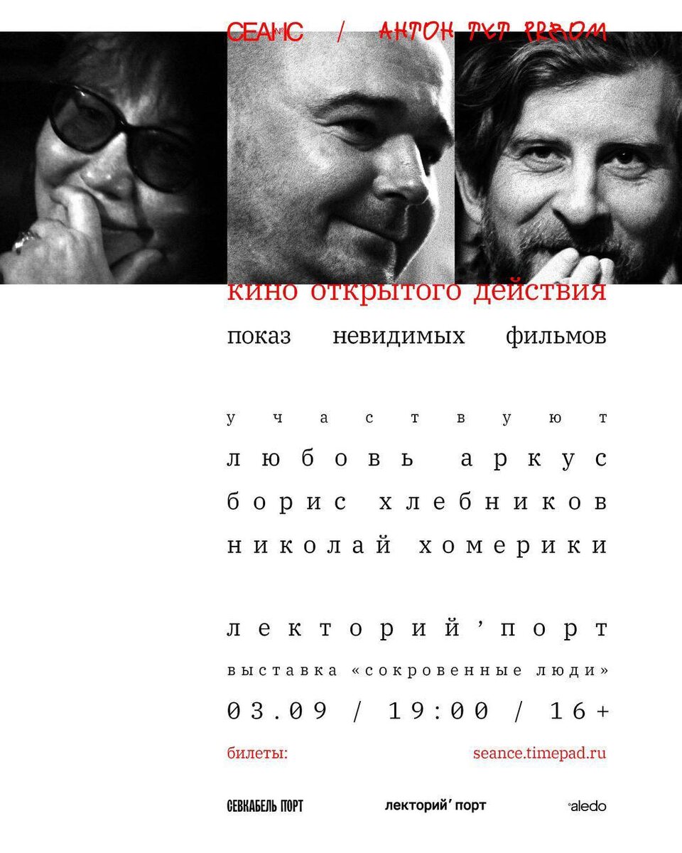 Петербуржцы! 🤍 Хочу поделиться анонсами двух важных событий: 3 сентября 19:00. Кино открытого действия. Показ невидимых фильмов Любовь Аркус, Борис Хлебников и Николай Хомерики расскажут о фильмах, которые снимали, чтобы помочь фонду «Антон тут рядом». Поговорят о проблемах и радостях кинопроизводства. О том, чего стоит один маленький фильм. А также покажут и обсудят фрагменты мало кем виденных работ. Билеты 🎫 6 сентября 19:00. Вечер открытых дверей Школы «Сеанс» с Александром Сокуровым На встрече Александр Николаевич Сокуров, чья судьба неразрывно связана с «Сеансом» на протяжении всей истории журнала, вместе Любовью Юрьевной Аркус и преподавателями Школы «Сеанс» обсудят современное кинообразование, его прошлое и нынешнее состояние, то, к чему мы пришли и то, куда мы идем. Разумеется, вы сможете задать все интересующие вас вопросы об учебе в Школе и, кто знает, быть может, самыми первыми узнаете некоторые потрясающие новости о будущем наборе. Билеты 🎫