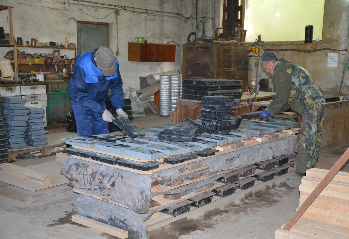 И показывает оборудование, которое приобрели на эти средства – это бетоносмеситель и вибростол, а из расходных материалов – формы для заливки плиток. Новое оборудование дало возможность открыть вторую линию производства в ПК Гранит-Декор, теперь здесь помимо самого Салавата Рашитовича трудится ещё два помощника. Ну а контролирует весь процесс производства сам предприниматель – объясняет, что технология требует точности и быстроты.