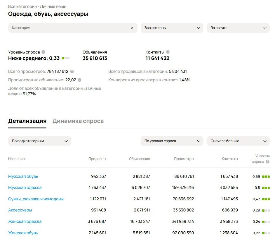 Спускаемся внутрь Одежды, обуви, аксессуаров: фавориты мужского раздела вышли на рекорд: обувь 0,59, одежда 0.5 Сумки-багаж тоже неплохая по спросу подкатегория (стабильно) сейчас это 0.47 и месяц не самый топовый в году! Женская одежда стандартно внизу списка. В августе она на одном уровне по показателю с аутсайдером всех сезонов Детской одеждой и обувью 0,24 Однако, именно таких товара продается больше всего: максимальное количество объявлений именно в Женской одежде. 16 миллионов