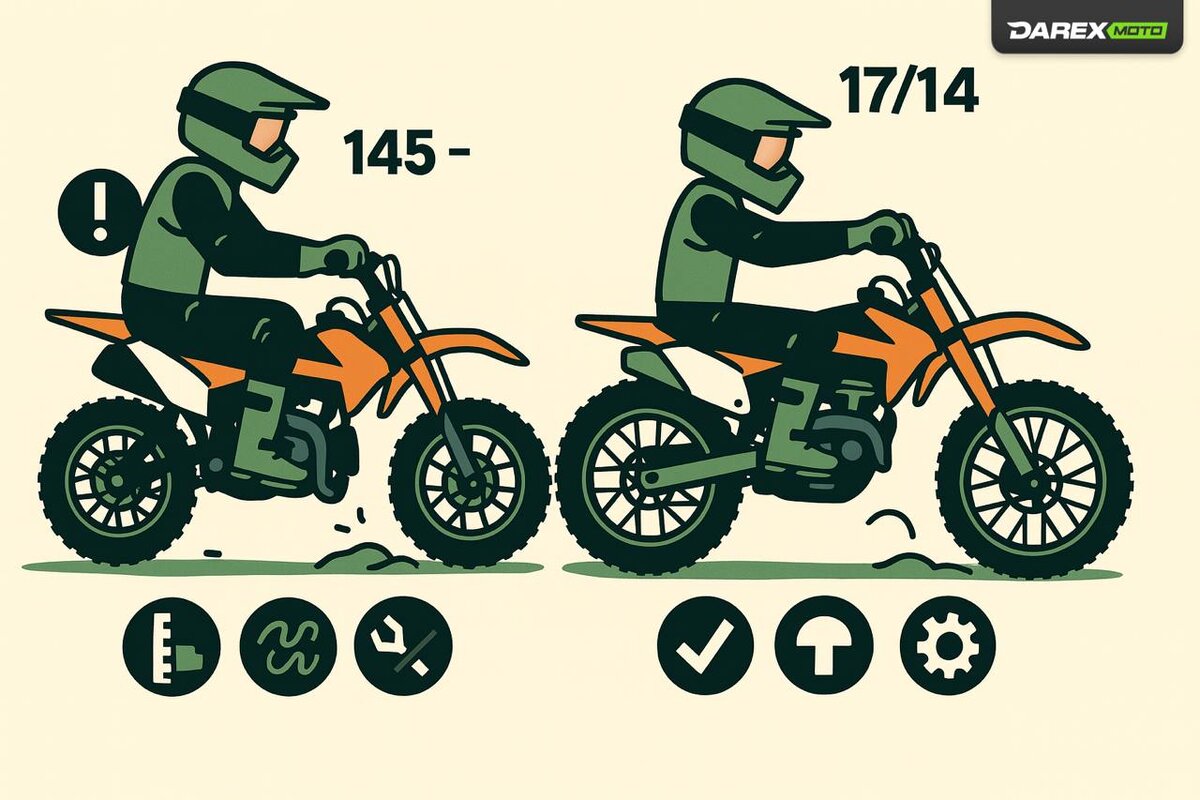 Питбайк «на вырост»: когда пора с 14/12 на 17/14? Быстрый чек: 📏 Рост 165+ и колени «под ушами» 🤨 Швыряет в колее, на кочках нервничает 🔧 Лапки/педали чиркают о землю 🫠 Подвеска часто «в донышко» (при нормальном SAG) Что даст 17/14: ✅ Больше стабильности и держак ✅ Легче перекатывать корни/ямы ↗️ Седло выше на ≈3–6 см (больше места в стойке) ⚠️ В узких поворотах — чуть «ленивее» Как ехать: 👀 Смотри дальше, корпус активней ⛔ Тормози чуть позже, но без геройства ⚙️ Если стало «длинновато» по тяге — короче звёзды (1 зуб спереди или +2 сзади) Важно: бери комплект 17/14 именно под твою модель (оси/втулки/диск). На каких колёсах сейчас? Напиши рост/вес/модель?