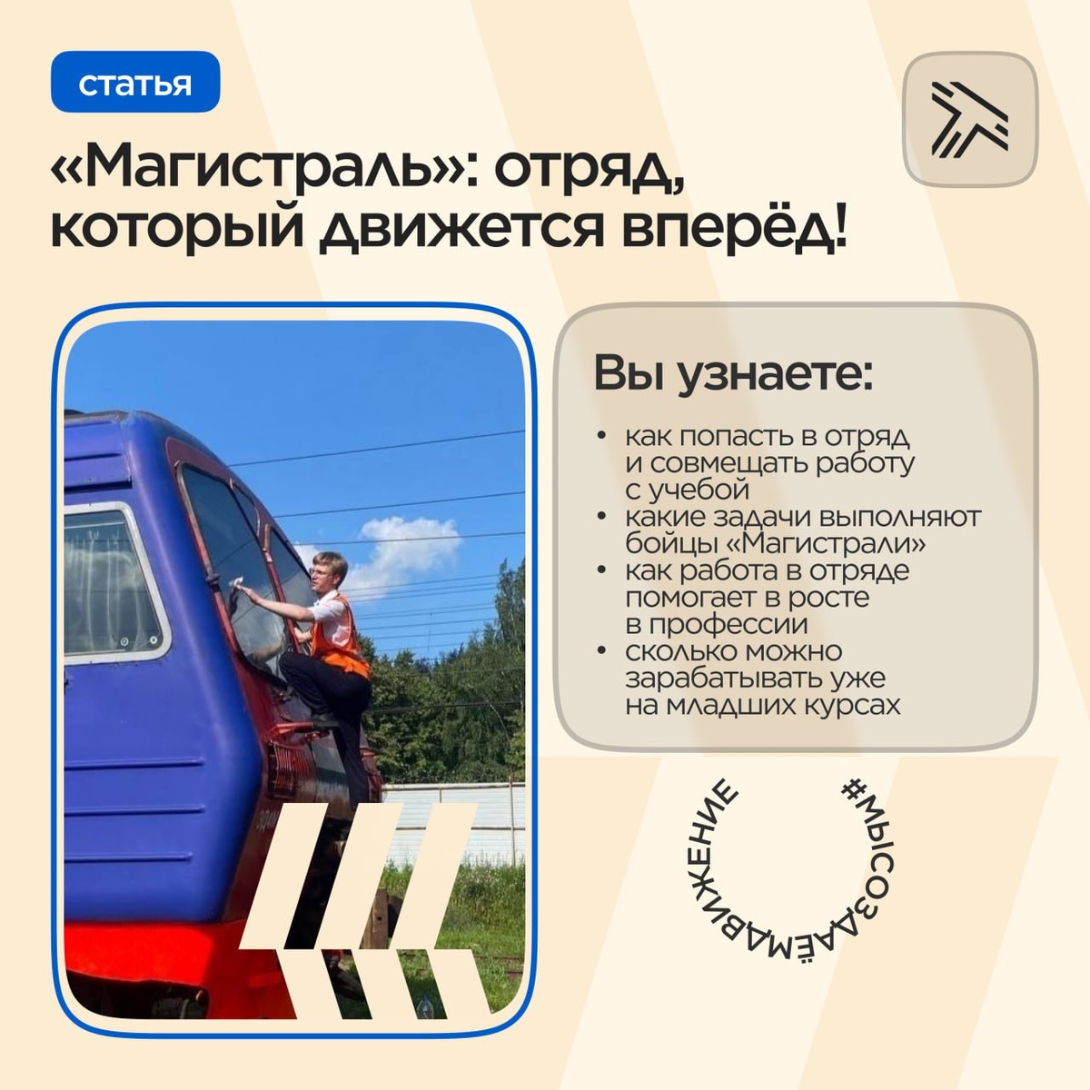В статье рассказываем о студенческом отряде помощников машиниста «Магистраль» ИТТСУ. О бойцах, которые готовы учиться и уже сегодня управлять движением целого электропоезда — из кабины электропоезда отвечать за безопасность тысяч пассажиров. ➡️Вы узнаете: • как попасть в отряд и совмещать работу с учебой • какие задачи выполняют бойцы «Магистрали» • как работа в отряде помогает в профессиональном росте • сколько можно зарабатывать уже на младших курсах Читайте статью и узнайте, как начать карьеру в РЖД еще до получения диплома! Будь в курсе событий РУТ