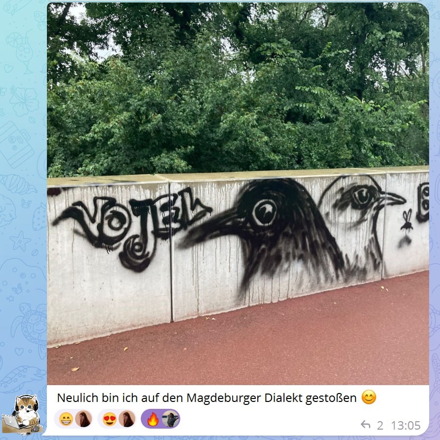 Птичка из Магдебурга 🐦⬛ Иногда студенты присылают нам такие интересности, которые мы ни за что не нашли бы сами. Например, наблюдение за диалектами в живой природе 👀 Теория гласит: Если вы попали в среду с носителями, предпочитающими диалект – тут мир ляйт, всего хорошего, выживайте как хотите. Практика показывает: Да, овладеть диалектом на том же уровне, что и впитавшие его с молоком матери немцы, – вряд ли реалистично. Но можно активно наблюдать за своим языковым окружением, узнавать и спрашивать – и тогда понимать диалектно окрашенную речь станет сильно проще. А ещё вы можете случайно перенять некоторые фонетические особенности вашего региона, это не редкость, а ещё - просто прекрасно 🍻 🔆 Наша студентка из Магдебурга прислала нам вот такое граффити с небольшим диалектным нюансом: в данном регионе g заменяется на ch или j. Machteburjerisch! 😎 💡 А как вы справляетесь с диалектом? Или у вас в окружении Hochdeutsch? Расскажите в комментариях! #wosagtmanwie 🔡 Учиться с нам