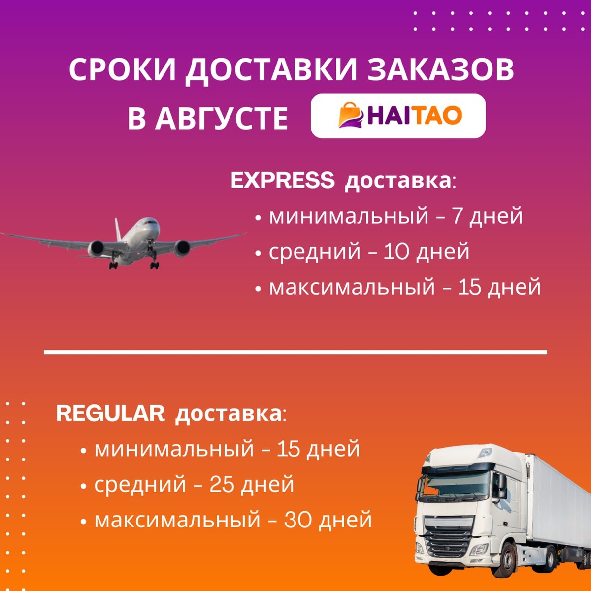 ⏱️ Собрали для вас свежую статистику! Посчитали средние сроки доставки заказов, которые отправлялись авиа ✈️ и авто 🚛 в августе 2025 года. Результаты — наглядно выше 👆 Хотите узнать, сколько будет идти ваш заказ? 📩 Пишите нам — сделаем расчёт доставки специально для вас! #доставкаHaiTao #логистикаКитай #доставкаизКитая #бизнессКитаем