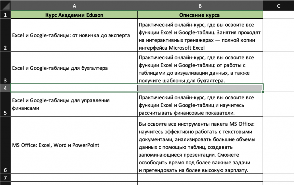 Метод подойдёт тем, кто работает с небольшими таблицами, в которых есть одна или несколько пустых строк. Их удобнее и проще удалить вручную. Вот как это можно сделать.
