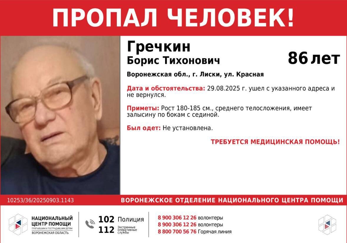 #пкпсцрегион36 #Гречкин ВНИМАНИЕ! ПРОПАЛ ЧЕЛОВЕК 86 лет! Гречкин Борис Тихонович Воронежская обл., г. Лиски, ул. Красная 🆘 ТРЕБУЕТСЯ МЕДИЦИНСКАЯ ПОМОЩЬ 🆘 Просим поделиться информацией, ваш репост поможет в поиске. Всем кому известна любая информация обращаться по телефонам 112 или 8 920 404 60 00, 8 900 306 12 26