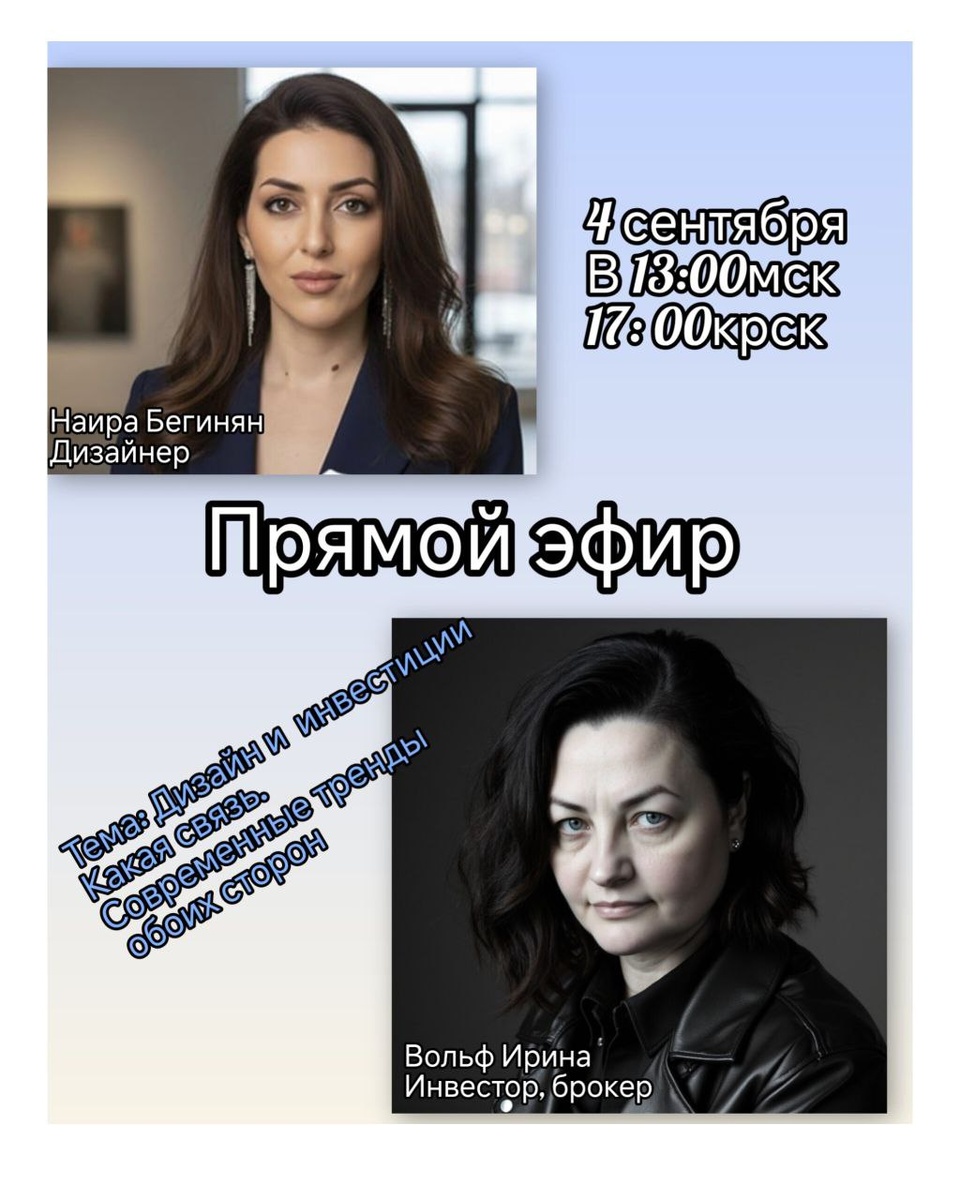 Друзья, давно я не проводила эфира на своем канале. Последнее время очень плохая связь. А этот и вовсе задолжала. Мой гость Наира Бегинян, профессиональный дизайнер. Подробнее с Наирой можно познакомиться в ее социальных сетях: Телеграмм t.me/desing_by_Naira Нельзяграм → @interior_design_com ВКонтакте → @design_by_nairab Ну и конечно на моё эфире. И вот уже завтра поговорим на очень интересную и актуальную тему. 🔅Дизайн и нвестиции. 🔅Нужен ли дизайнер интерьеров в инвестиционных проектах. 🔅Как минимизировать вложения при дорогом ремонте( флиппинг) 🔅Редивелопмент, разработка дизайн проекта 🔅Фишки интерьера при продаже, что ципляет (Хоум-стейджинг) 🔅А так же вы можете задать Наире любой для вас актуальный вопрос на сегодня. Итак ждём вас завтра на эфире, надеюсь нам ничего не помешает и связь будет отличная.