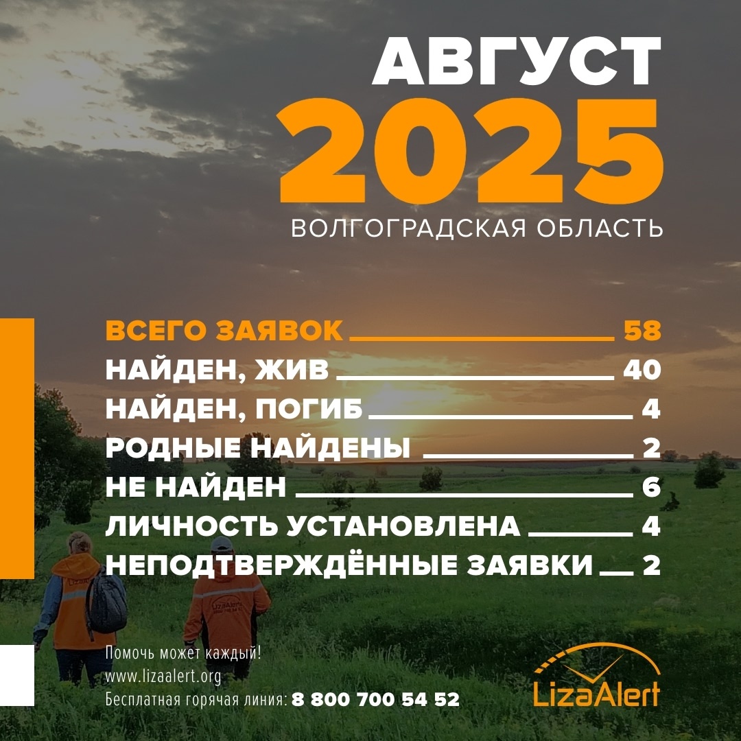 Волгоградское подразделение поискового отряда «Лиза Алерт» представило статистику за август 2025 года. Всего в отряд поступила 58 заявок на поиск пропавших людей в Волгоградской области. Большая часть из них — 40 — завершились благополучно. Все они были найдены живыми. К сожалению, четверо погибли. Среди них — подросток, который в ночь с 27 на 28 августа ушел на ночную рыбалку и не вернулся. Следственными органами по факту безвестного исчезновения было возбуждено уголовное дело. В результате поисков тело подростка обнаружено в Сарептском затоне в районе понтонного моста. На месте поисков были обнаружены личные вещи юноши, а также рыболовные снасти. Мобильный телефон при этом отсутствовал. Незадолго до исчезновения юноша слал голосовые сообщения. Он шепотом рассказывал, как спускается по песку и видит, как «что-то светится». По словам подростка, ему показалось, что он видит мужской силуэт, но на месте в итоге никого не оказалось. Поиски еще 6 пропавших без вести продолжаются: распростр