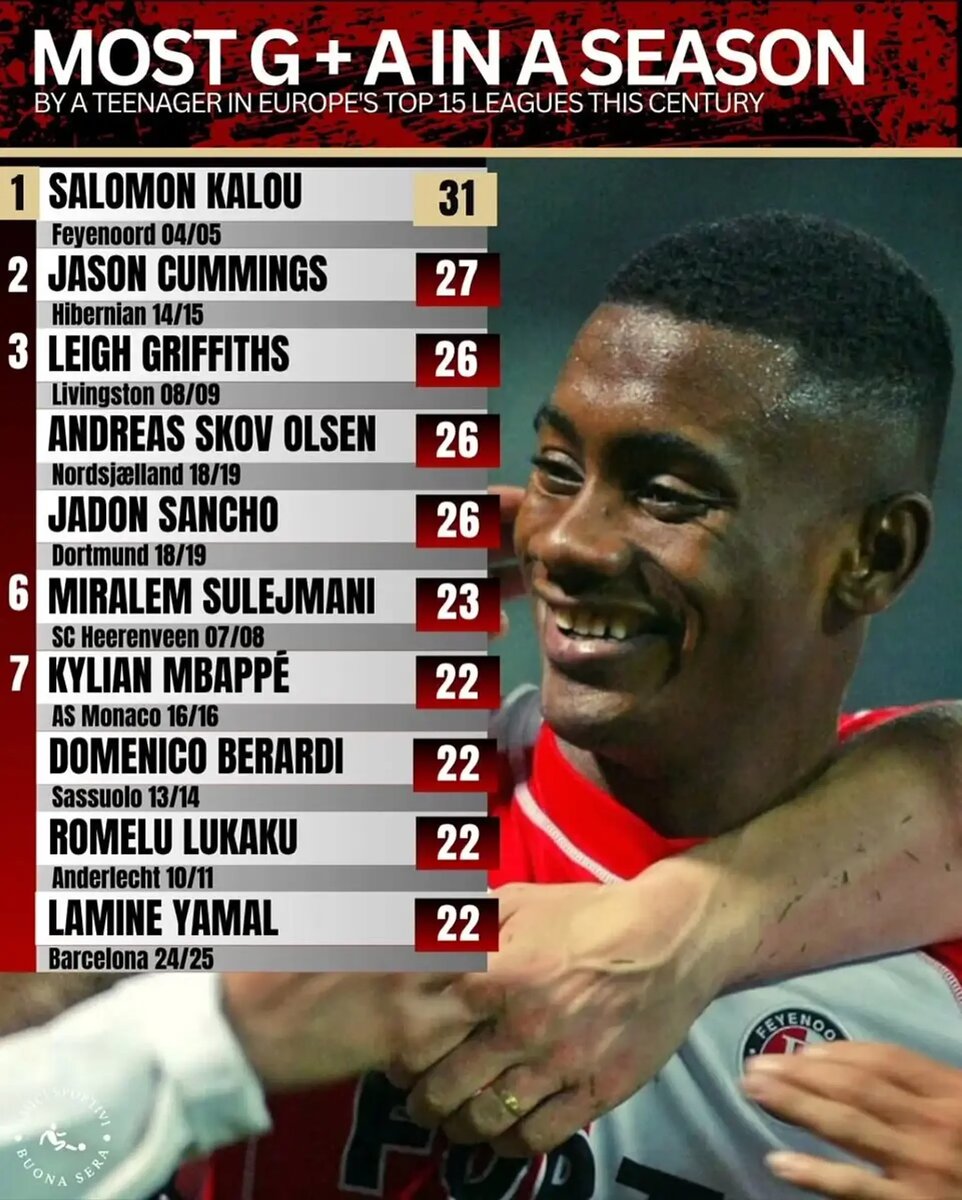 За последние десятилетия десятки юных талантов ворвались во взрослый футбол, но немногие смогли оставить яркий след ещё в подростковом возрасте. Исследование по 15 топ-лигам Европы выявило игроков с наибольшим количеством голов и ассистов во внутреннем чемпионате с 2000 года. Неожиданно лидером списка оказался Соломон Калу, который в 2005-м сиял в «Фейеноорде». Джейдон Санчо замыкает тройку благодаря своим выступлениям за «Боруссию». На седьмой строчке — сразу двое: Килиан Мбаппе времен «Монако» и Ламин Ямаль из «Барселоны». Испанцу всего 17, и у него есть два сезона, чтобы превзойти достижение Калу. Карьеры этих игроков доказывают: если ты достаточно хорош, возраст не имеет значения.