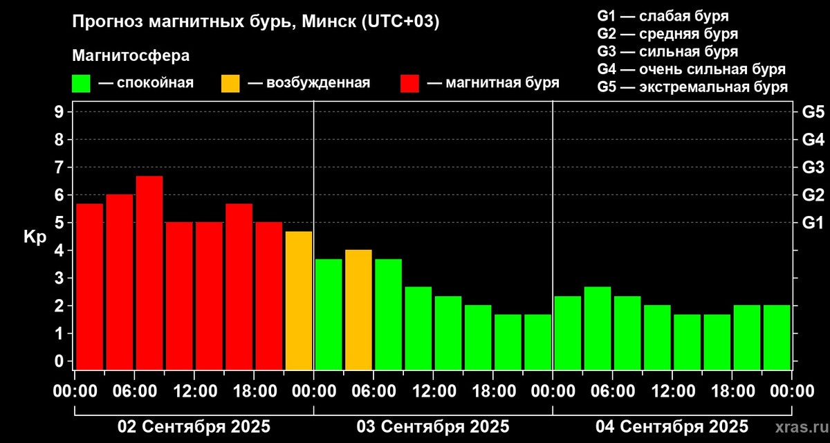 2 сентября в Беларуси фиксировались значительные магнитные бури. По данным Лаборатории солнечной астрономии ИКИ и ИСЗФ, уровень возмущений над Минском достигал G2,7. Согласно классификации лаборатории, магнитная буря уровня G3 считается «сильной». Это спровоцировало полярные сияния, которые были видны в разных частях нашей страны. В ночь с понедельника на вторник космические аппараты, расположенные в так называемой точке Лагранжа, зарегистрировали выброс солнечной плазмы, что вызвало удар по магнитному полю Земли. Вскоре, согласно данным мировой сети станций, начались магнитные бури планетарного масштаба. По информации Лаборатории солнечной астрономии ИКИ и ИСЗФ, в Минске фиксировались геомагнитные бури на протяжении всего вторника — от уровня G1 до G2,7. К концу дня магнитосфера начала успокаиваться и бури прекратились. Дополнено. Из-за геомагнитных бурь возникают полярные сияния, которые в этот раз были видны даже из Беларуси. Читатель Onlíner смог сделать красивые снимки на Минском