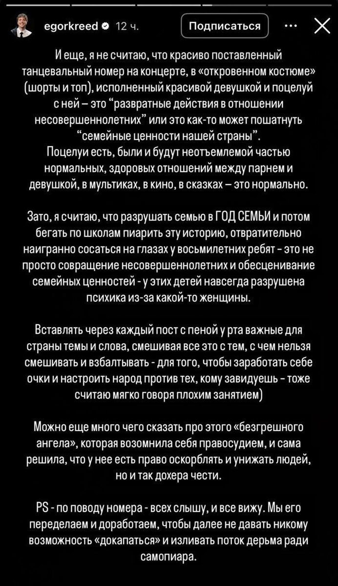 🌟🌟🌟 Екатерина Мизулина назвала концерт Егора Крида «голой вечеринкой» и потребовала СК и Генпрокуратуру провести проверку. Глава Лиги безопасного Интернета рассказала в своем телеграм-канале о том, что ей поступили тысячи писем, в которых родители возмутились выступлением Крида. По их словам, на мероприятии с маркировкой 12+ были откровенные танцы и развратные действия. Причиной для такой негативной реакции стал номер, в котором артист целуется прямо на сцене со своей танцовщицей. Крид в запрещенной социальной сети ответил на такую резкую критику. Он заявил, что не считает, что красиво поставленный танцевальный номер и поцелуй с девушкой могут пошатнуть семейные ценности. Артист напомнил, что сама Мизулина целовалась с SHAMANом на глазах у школьников и «это не просто совращение несовершеннолетних и обесценивание семейных ценностей — у этих детей навсегда разрушена психика». Несмотря на несогласие с обрушившейся критикой Егор Крид все же обещал немного доработать номер, чтобы впре
