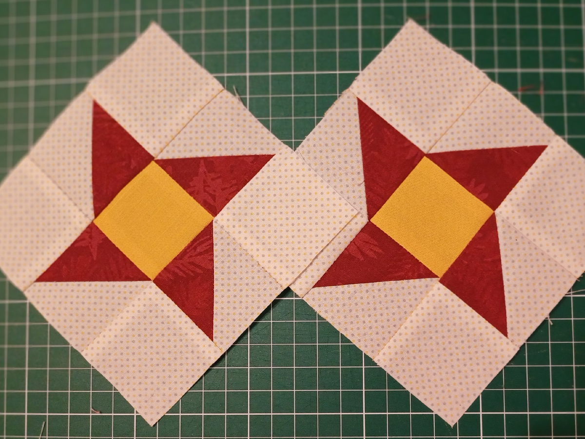 Очень простой и легкий блок в пошиве. Сшила блок размером 4 1/2“. Детали кроя: Основная/фоновая ткань: · 2 квадрата размером 2“ для уголков блока · 2 квадрата размером 2 1/2“. Центр - желтая ткань: · 1 квадрат размером 2“ Бордовая ткань: · 2 квадрата размером 2 1/2“. Инструкции по шитью блока: Шьем основные детали блока, из которых строится рисунок, треугольники в квадрате. 1. На фоновых квадратах размером 2 1/2“ проводим диагональ. 2. Совмещаем фоновые квадраты размером 2 1/2“ с бордовыми квадратами. 3. Прокладываем 2 строчки на расстоянии 1/4 от диагонали и разрезаем по диагонали. Разутюживаем. 4. Убираем излишки - обрезаем полученные квадраты до квадрата размером 2 дюйма. 5. Раскладываем все детали по схеме блока. Сшиваем в ряды и разутюживаем. 6. Ряды сшиваем между собой. Бок готов! Размер блока с припусками – 5”. В моем размере блок небольшой и прекрасно подойдет для шитья изделий небольшого размера – подушек, салфеток, прихваток. Хотя и для детских одеял размер тоже