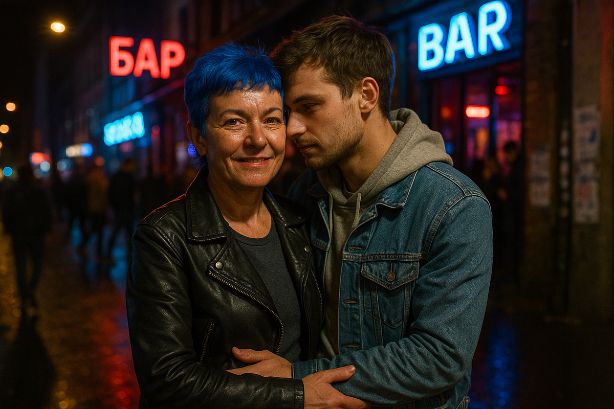 Апогея всё достигло в прошлую субботу. Я заехала к ней забрать банки с огурцами, которые она закатала для нас и которые стояли в прихожей. Подъезжаю к её дому — а там толпа народу, столпотворение. И в центре — моя мама. В той самой косухе, с синими волосами. И рядом с ней… огромный, блестящий, рычащий мотоцикл. "Харлей" или что-то в этом роде. Я даже марок не знаю. Рядом — пара здоровых лбов в кожаных жилетах, с бородами, в банданах. Классические байкеры.