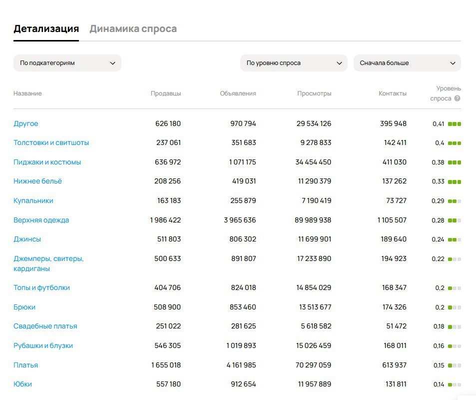 В густонаселенной подкатегории Женская одежда ситуация такова: сдвинули вниз списка Купальники, их оттеснили Толстовки-свитшоты. Это стоит принять к сведению, ибо объясняемо сезонностью и будет торговаться и в сентябре, скорее всего даже лучше по показателям. Не все заранее готовятся к сезону, многие склонны пополнять гардероб по факту нужды, т.е. с наступлением прохладной погоды. В Верхней одежде и Платьях намного больше продавцов, чем по другим элементам женского гардероба. Стоит учесть! Это означает более высокую конкуренцию, при невысоком спросе.