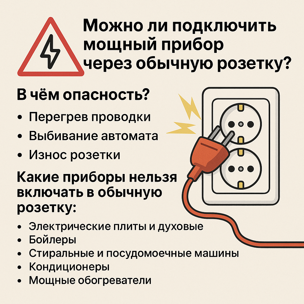Многие включают в обычную розетку мощные приборы: электрические плиты, бойлеры, кондиционеры, обогреватели. Это опасная ошибка, которая может привести к поломке техники и пожару. --- В чём опасность? 1. Перегрев проводки Стандартная розетка рассчитана на ток до 16А (≈ 3,5 кВт). Если нагрузка выше, провода начинают сильно греться и могут оплавиться. 2. Выбивание автомата Автомат отключит сеть при перегрузке, но если он неправильно подобран — риск пожара остаётся. 3. Износ розетки Контакты обычной розетки не предназначены для постоянной высокой нагрузки, они быстро ослабевают и начинают искрить. --- Какие приборы нельзя включать в обычную розетку? Электрические плиты и духовые шкафы. Бойлеры. Стиральные и посудомоечные машины. Кондиционеры. Мощные обогреватели. --- Как подключать правильно? 1. Для мощных приборов нужна отдельная линия от щитка. 2. Ставится отдельный автомат по мощности прибора. 3. Используется розетка и кабель с подходящим сечением. --- ✅