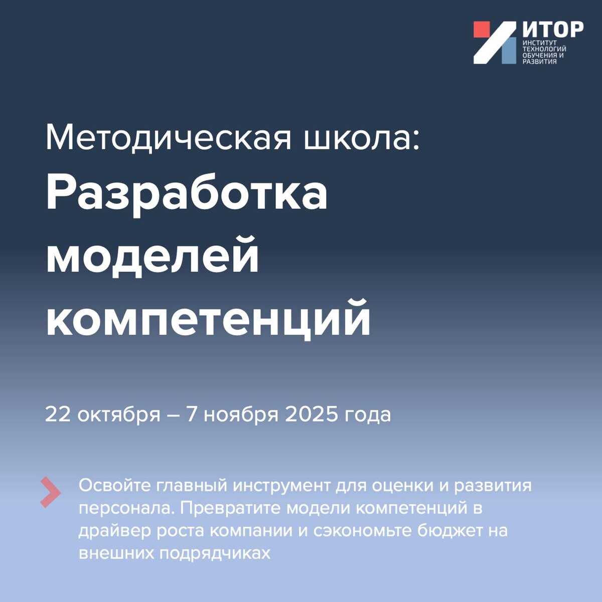 ОСВОЙТЕ ТЕХНОЛОГИЮ РАЗРАБОТКИ МОДЕЛЕЙ КОМПЕТЕНЦИЙ ЗА 3 НЕДЕЛИ После этой школы вы сможете разрабатывать модели компетенций самостоятельно — без внешних подрядчиков и лишних затрат. Программа, даты и преподаватели — в карточках ☝️ ЗАПИСЬ ОТКРЫТА👇 🔗 itor.ru/metod_competence