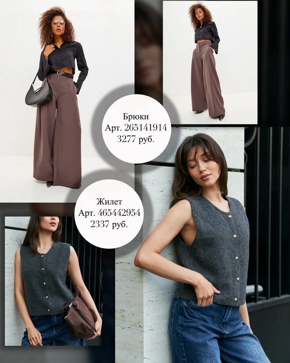 - Городской смарт-кэжуал: брюки 265141914 + жилет 465442954 + белая рубашка + ботильоны.