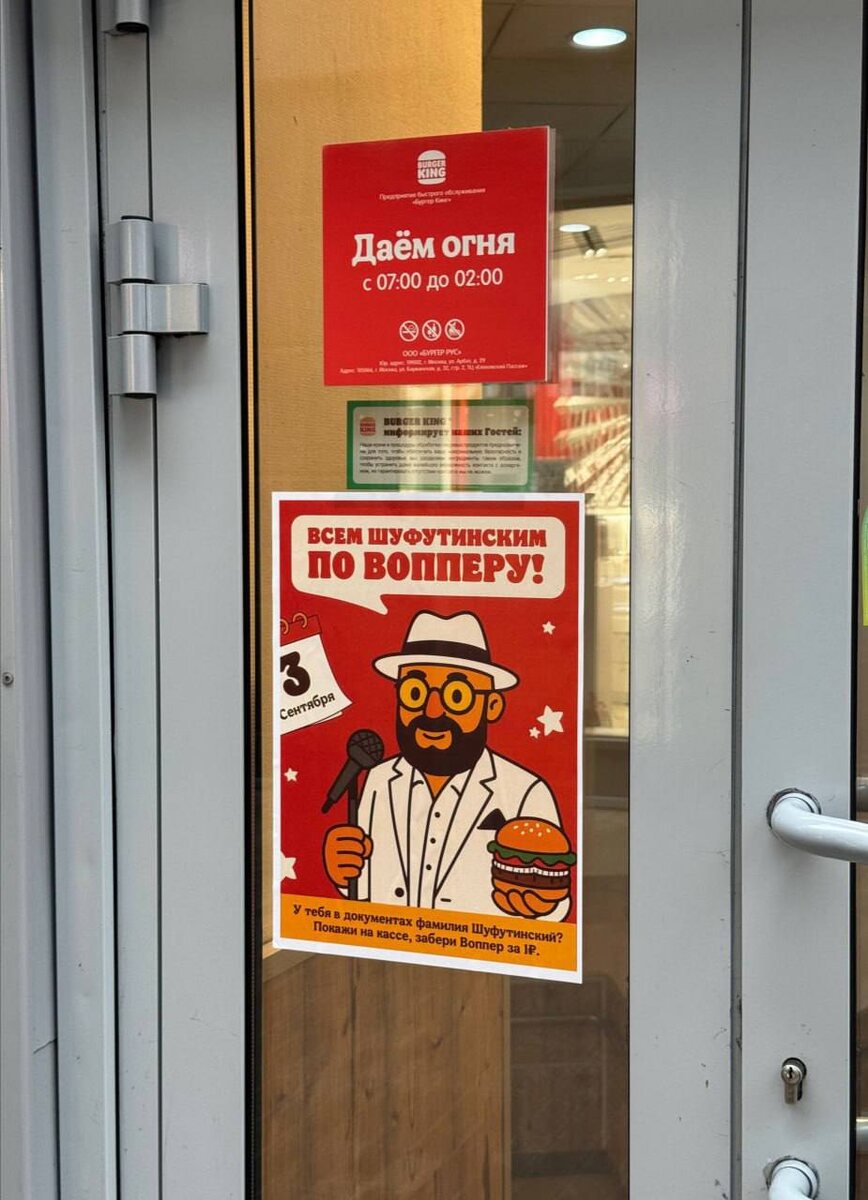 Бургер Кинг подарит воппер всем с фамилией ШУФУТИНСКИЙ 3 сентября