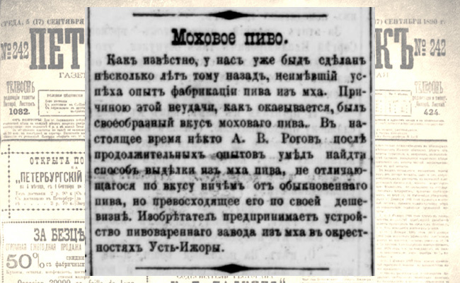 Как известно, у нас уже был сделан несколько лет тому назад, не имевший успеха опыт фабрикации пива из мха. Причиною этой неудачи, как оказывается, был своеобразный вкус мохового пива. В настоящее время некто А.В. Рогов после продолжительных опытов умел найти способ выделки из мха пива, не отличающегося по вкусу ничем от обыкновенного пива, но превосходящее его по своей дешевизне. Изобретатель предпринимает устройство пивоваренного завода из мха в окрестностях Усть-Ижоры.