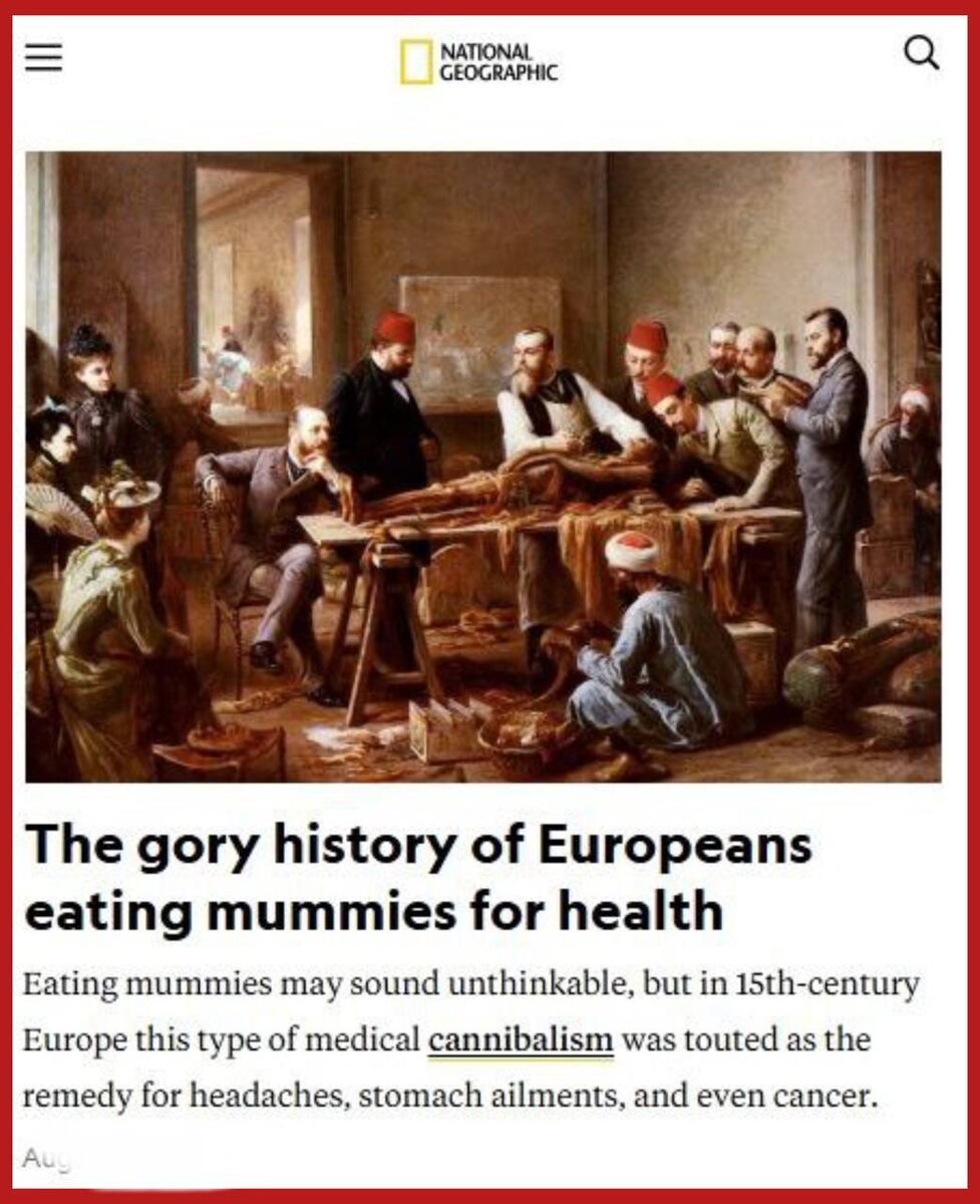 В 15 веке в Европе был популярен медицинский каннибализм Люди употребляли останки других людей в качестве лекарств от многих болезней – головной боли, расстройства пищеварения и даже рака. Начали с египетских мумий, а потом уже жрали все подряд. Лишь бы это был неразложившийся человеческий труп. А виной всему ошибка в переводе. Во время испанской Реконкисты в руки европейских ученых попали арабские медицинские труды. И вот там они наткнулись на многочисленные упоминания о чудодейственном снадобье, которое помогало чуть ли не от всех болезней. Называлось – mumia. Теперь-то мы знаем, что имелось в виду мумиё – субстрат растительного происхождения, окаменелые продукты разложения растений, смешанные с горными смолами. Вот европейцы и попутали. Они решили, что mumia – это забальзамированные останки людей («мумия» по-латыни – именно mumia). И стали их кушать для здоровья. И кушали несколько веков. Медицинский каннибализм был широко распространен и популярен. Подпишись на Телеграм Алексан