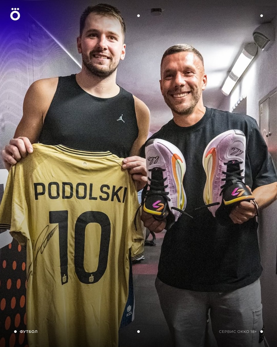 Лукас Подольски встретился с Лукой Дончичем. Спортсмены обменялись подарками: словенец подарил кроссовки, а немец — именную футболку ⚽ ️🤝 🏀