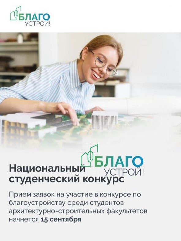 Студенты-архитекторы, для вас – еще один конкурс – «Благоустрой!» ✨Главный приз – Гран-при в размере 1 млн. рублей получит лучший архитектурный проект благоустройства общественных пространств. 👉Подать заявку на участие можно с 15 сентября до 30 октября. Хотите узнать подробнее о номинациях и требованиях к проектам, переходите на наш сайт