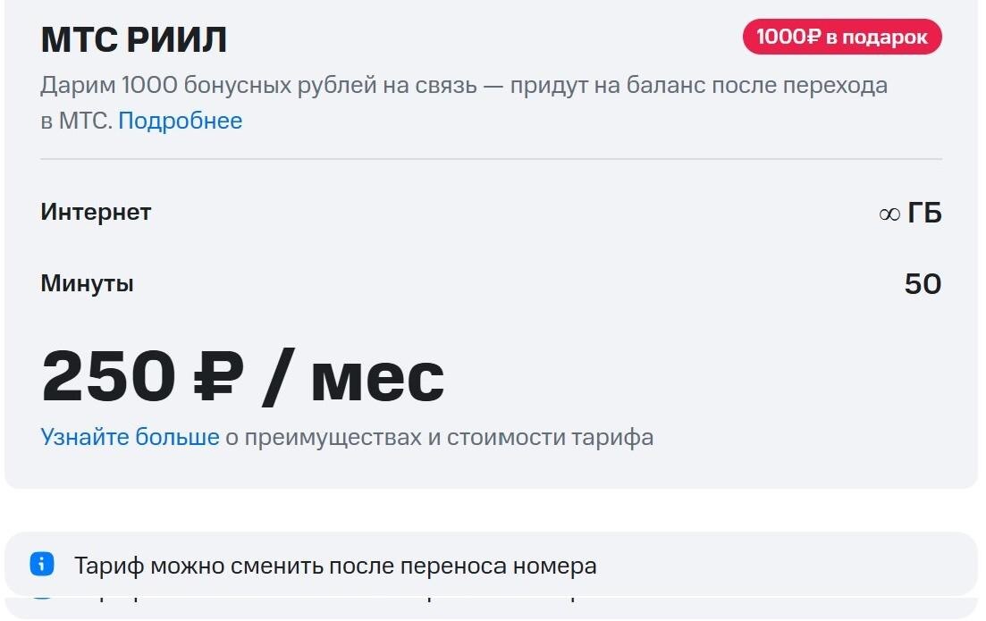 В рамках акции МТС дарит 1000 ₽ за перенос номера для оплаты услуг связи и дает 50% скидки на тариф «РИИЛ» на один год с момента переноса номера. Таким образом новый абонент получает безлимитный интернет всего за 250 ₽ в месяц на целый год.