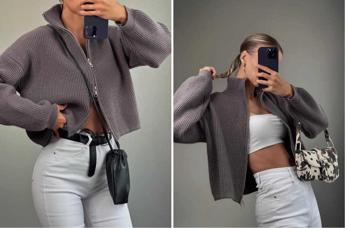 Свитер — это, наверное, самая первая мысль, которая приходит в голову, когда думаешь об осени. И этот вариант просто идеален. Он такой уютный и объёмный, что кажется, будто тебя обнимает пушистое облако. А ещё у него есть классная деталь — молния. Можешь расстегнуть и сделать сексуальный V-образный вырез, а можешь застегнуть до самого горла и спрятаться от ветра. Это так удобно!