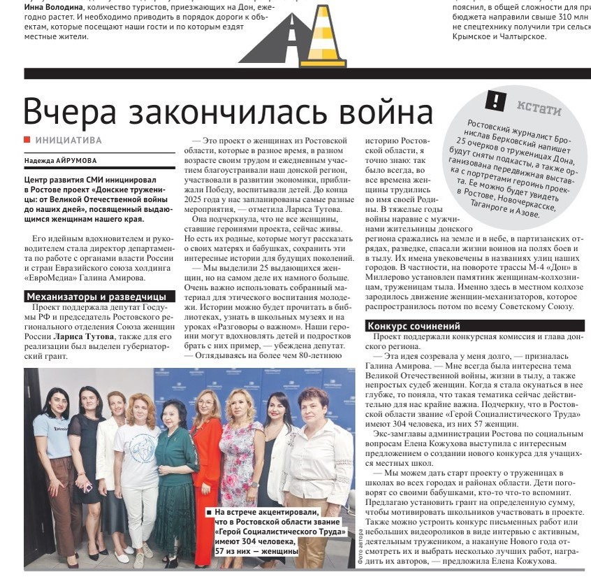 Звания «Герой Соцтруда» были удостоены 304 жителя донского края, 57 из них — женщины Депутат Госдумы РФ, глава Ростовского реготделения Союза женщин России Лариса Тутова поддержала проект «Донские труженицы: от Великой Отечественной войны до наших дней». «Не все 25 женщин, ставшие героинями проекта, сейчас живы. Но есть их родные, которые могут рассказать о своих матерях и бабушках, сохранить эти интересные истории для будущих поколений. В тяжелые годы войны наравне с мужчинами они сражались на земле и в небе, в партизанских отрядах, разведке, спасали жизни воинов на полях боев и в тылу. Их имена увековечены в названиях улиц наших городов. В частности, на повороте трассы М-4 «Дон» в Миллерово установлен памятник женщинам-колхозницам, труженицам тыла», — рассказала Лариса Тутова. 📍Руководителем проекта стала директор департамента по работе с органами власти России и стран Евразийского союза холдинга «ЕвроМедиа» Галина Амирова. 📰Подробности читайте в «Молоте» у Надежды Айрумовой.