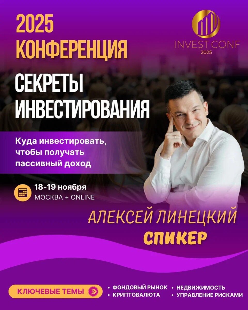 ⚡️ Друзья, приглашаю вас на главное событие для инвесторов этой осени — INVESTCONF-2025. Конференция пройдёт 18–19 ноября в Москве, также будет онлайн-трансляция для тех, кто не сможет приехать. Опытные инвесторы поделятся своими секретами, цифрами, решениями и выводами. Ключевые вопросы конференции: ✅ Пассивный доход. ✅ Управление рисками. ✅ Фондовый рынок. ✅ Криптовалюта. ✅ Недвижимость. 👉 Я буду выступать на конференции с темой: “Самая простая и стабильная стратегия на фондовом рынке в период неопределенности. С чего начать новичку в инвестициях?”. Количество мест в зале ограничено. Смотрите полную программу конференции и успевайте зарегистрироваться, чтобы занять места поближе к сцене. 👉 ПОЛНАЯ ПРОГРАММА И БИЛЕТЫ ТУТ 🔥 Для моих подписчиков самые лучшие условия. По промокоду aleksei вы можете получить дополнительную скидку 10%! Буду рад увидеться лично, пообщаться и обсудить то, что действительно волнует инвесторов сегодня.