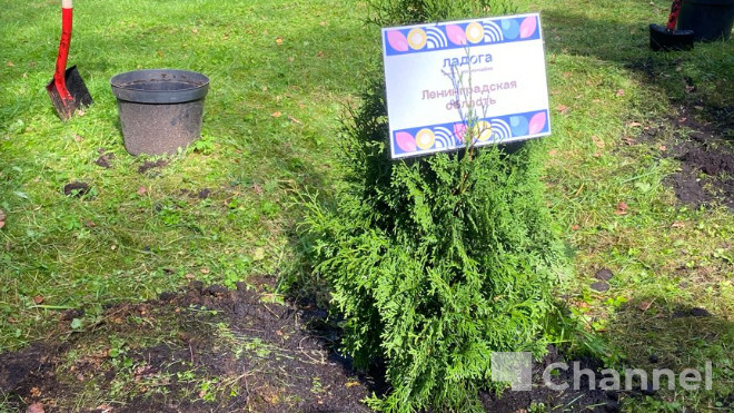 Гости форума "Ладога" в Ленобласти посадили туи на "Аллее Героев"
