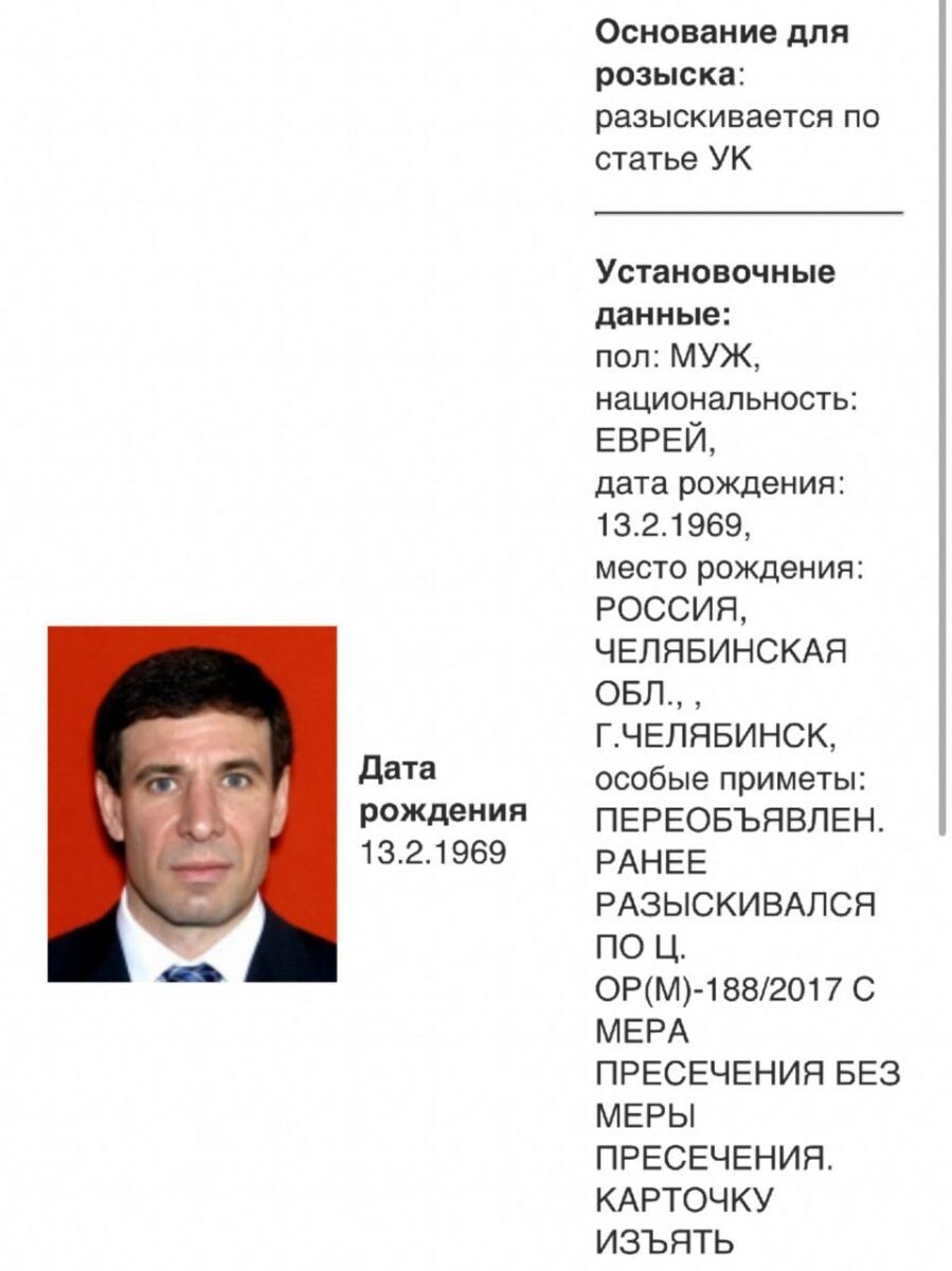 Экс-губернатор Челябинской области Михаил Юревич переобъявлен в федеральный розыск. В официальной базе МВД Юревич значится как разыскиваемый по уголовной статье. Конкретная статья УК РФ не указана. «Разыскивается по статье УК», — говорится в основании для розыска в соответствующей базе МВД. Юревич занимал пост губернатора Челябинской области с 2010 по 2014 год. Экс-губернатора объявили в розыск в 2017 году. Тогда он стал фигурантом уголовного дела по нескольким статьям, включая получение взятки и подстрекательство к клевете. ПОДРОБНЕЕ: Суд оставил в силе решение о заочном аресте Михаила Юревича Ранее «Бизнес журнал. Урал» сообщал, что в начале августа экс-губернатора Челябинской области Бориса Дубровского также объявили в розыск. «Бизнес журнал. Урал» в Дзене