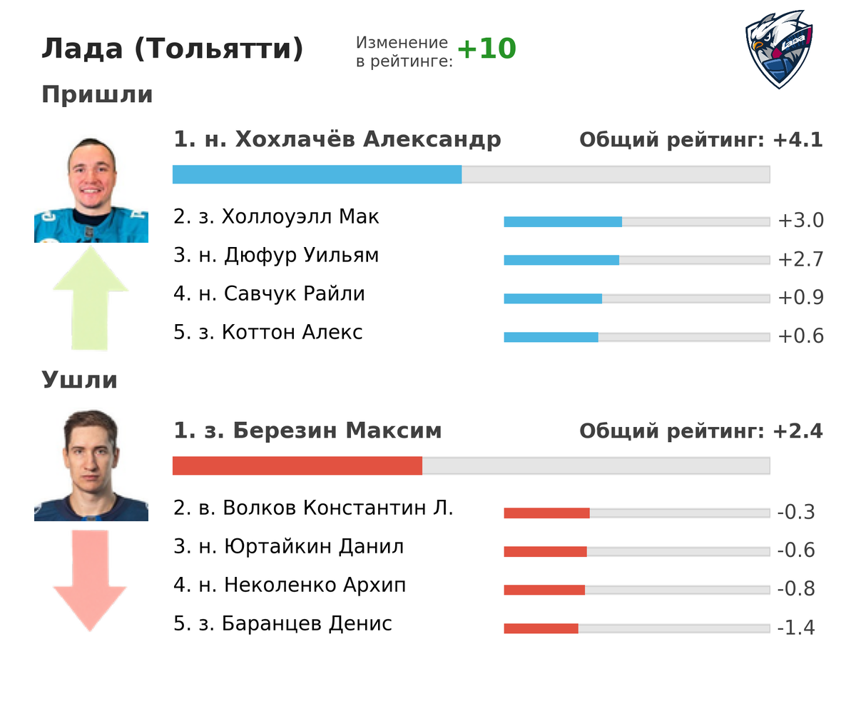 Трансферное окно для «Лады» можно без сомнения назвать успешным. Приглашение Александра Хохлачева, Мака Холлоуэлла и нескольких крепких легионеров заметно укрепило позиции тольяттинцев и повысило их шансы на успешный сезон. Из ощутимых потерь стоит отметить разве что Максима Березина — единственного защитника «Лады», сыгравшего больше 50 матчей и закончившего сезон с положительным показателем полезности.